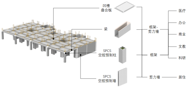 本项目采用SPCS结构体系的多种新技术,其中包括叠合柱一次成型技术、空腔柱“四角金砼+四边天铁”组合连接技术、不出筋桁架叠合板技术。