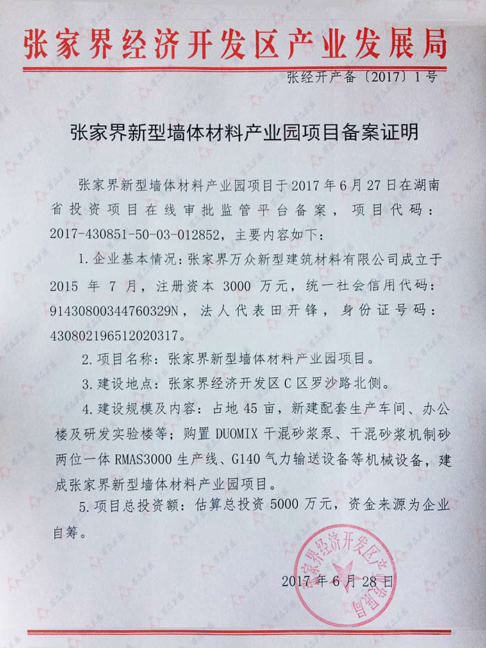 张家界新型墙体材料产业园项目备案证明